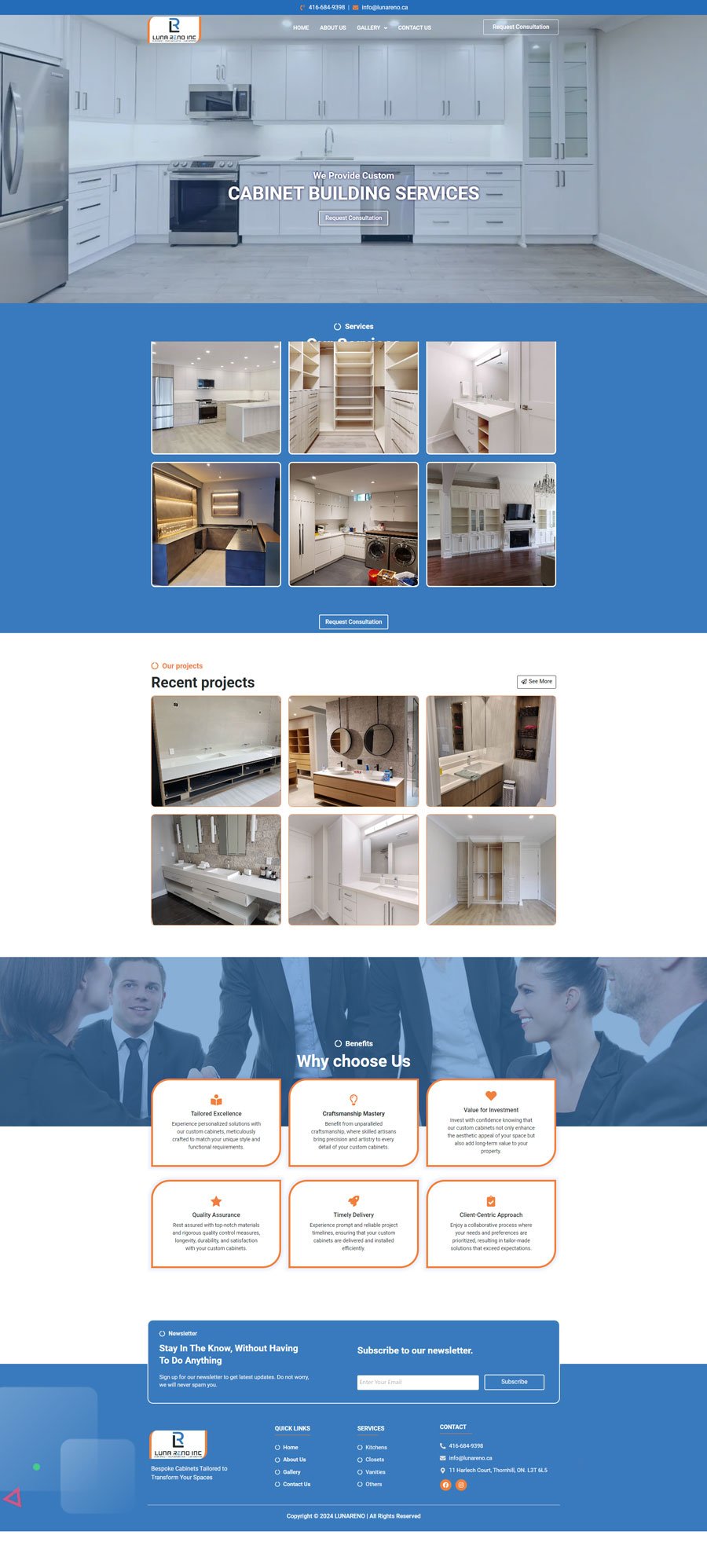 Website Design and Development: We developed a responsive, user-friendly website that highlights LUNA RENO INC.’s services and expertise. The site features an attractive layout with high-quality images of completed projects, detailed service descriptions, and client testimonials. Additionally, we integrated a portfolio section to showcase past projects, demonstrating their craftsmanship and attention to detail.