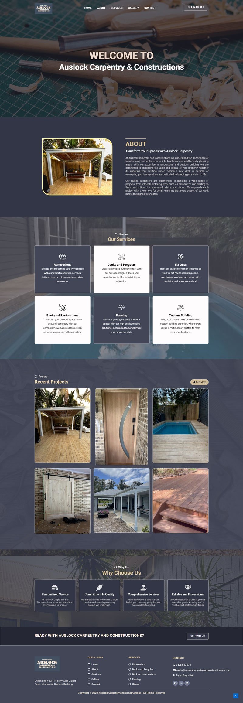 Website Design and Development: We developed a responsive, user-friendly website that effectively showcases Auslock Carpentry & Constructions’ services. The site features an attractive layout with high-quality images of their projects, detailed descriptions of their services, and client testimonials. Additionally, we integrated a portfolio section to display past projects, demonstrating their expertise and craftsmanship. Once potential clients visited the website, they were impressed by the professional presentation of services, the detailed portfolio, and positive client testimonials. The website’s overall appearance and functionality encouraged them to explore and consider Auslock Carpentry & Constructions for their needs.