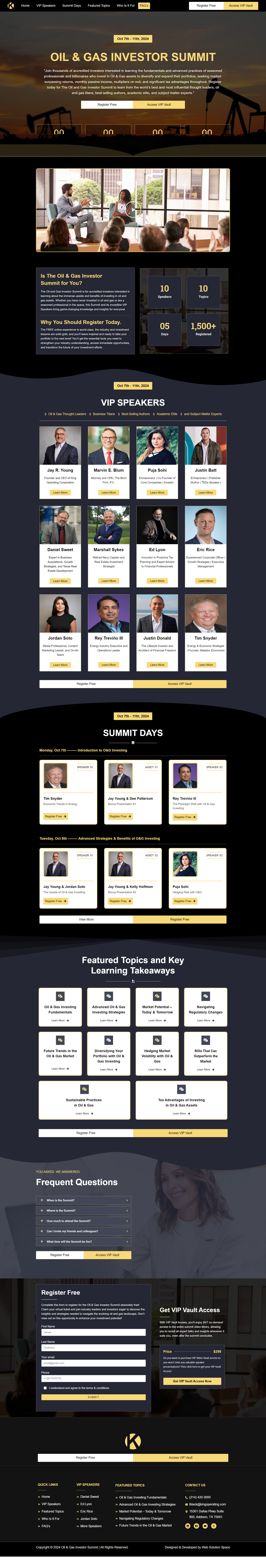 Travis Baldwin, the owner of the Oil & Gas Investor Summit, sought to launch a comprehensive online platform for the summit. The primary goals were to generate leads, host a live summit, and provide lifetime access to recorded sessions. A professional and functional website was essential to facilitate these objectives and enhance the overall attendee experience.